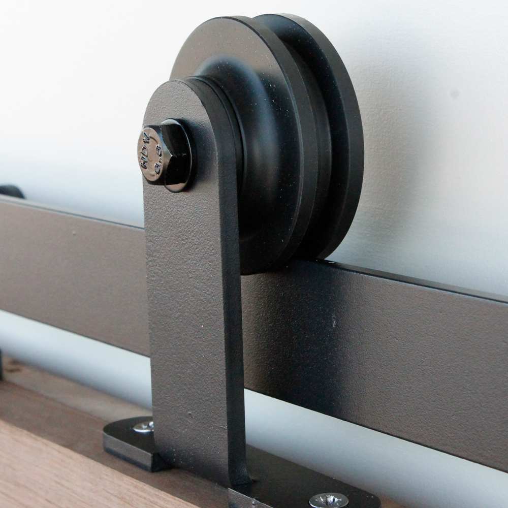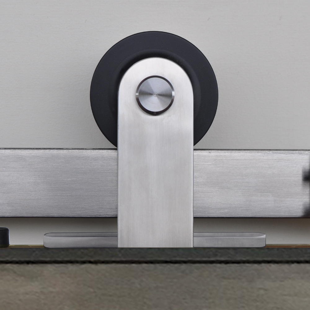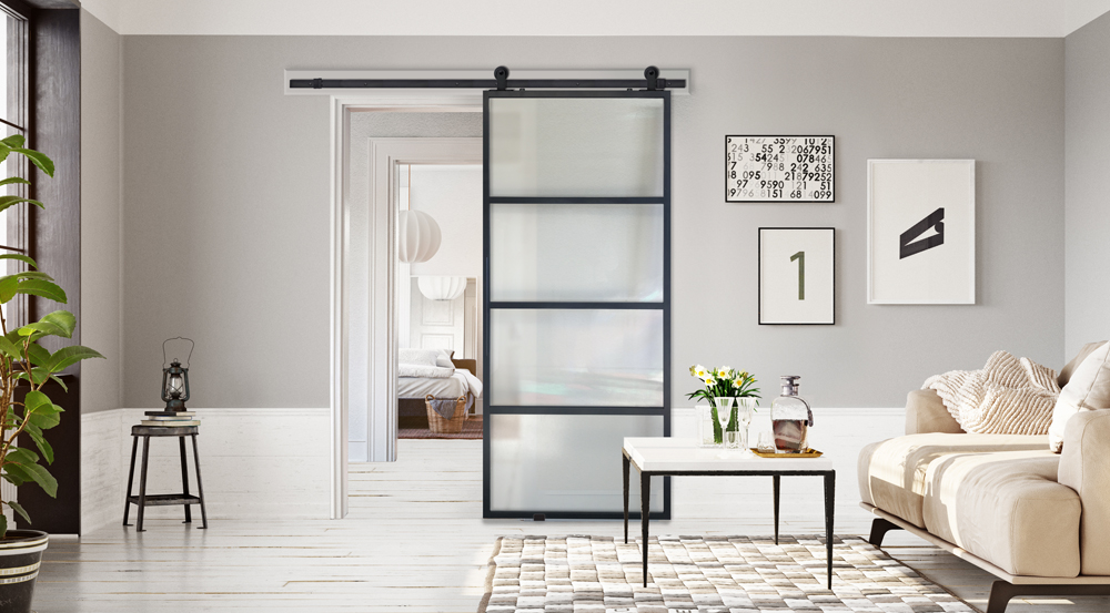 The four Contemporary Metal door designs are available in two heights (84” and 96”), and two widths (36” and 42”). The door stiles and rails are 1-5/8” wide, and coated with a permanent black finish — other finish options are not available. The tempered safety glass is available in 2 different glass types: Clear or Cloud. Only the Gage hardware may be used with this door, but it is not included and should be ordered separately. The Gage is available in black or stainless steel finishes. See page 8 for more sliding hardware information.